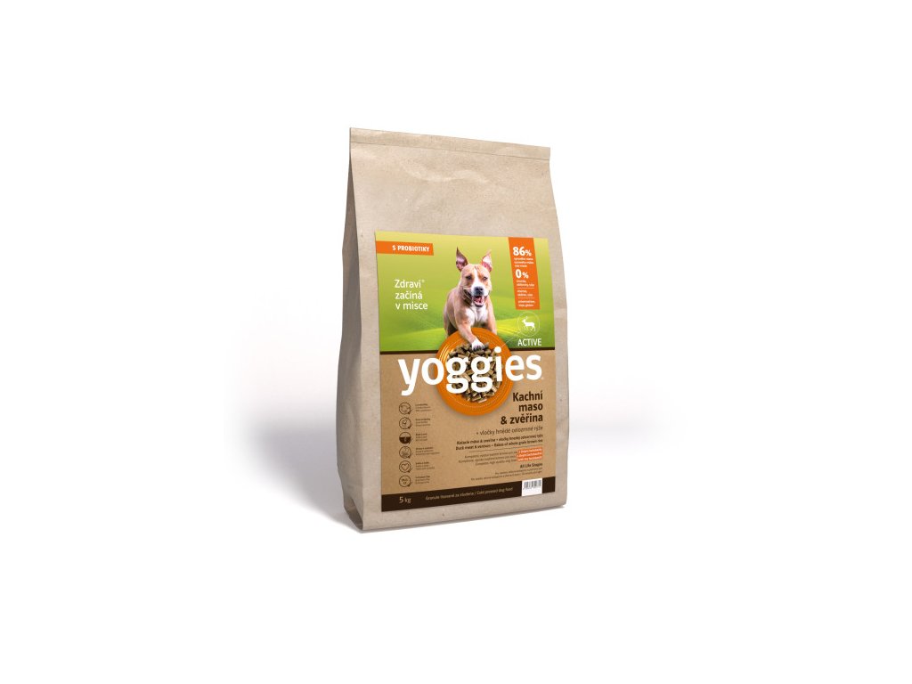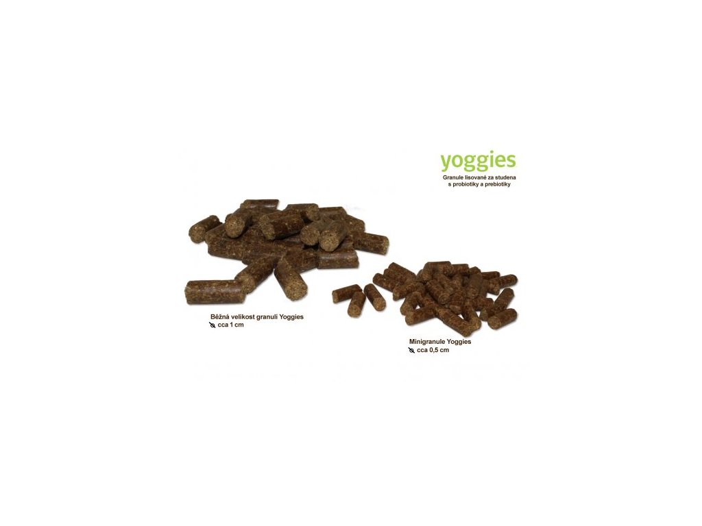 Za studena lisované granule Yoggies obsahují 87 % kvalitního masa před sušením – tzn. před ztrátou vody, která se v masu přirozeně vyskytuje. Po vysušení masa se tak objem zredukuje na cca 35-40 % celkové původní váhy. Probiotika v granulích podporují imunitu i zdravý trávicí trakt. Jsou výborně stravitelné a nebobtnají (potlačují riziko torze žaludku).