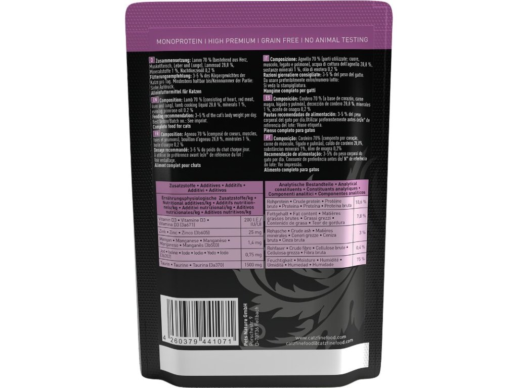 Lahodná konzerva pro kočky, která obsahuje pouze jehněčí maso, vývar, minerální látky a pupalkový olej. Konzerva je tak vhodná i pro kočky s citlivým zažíváním nebo pro alergické kočky. Jedná se o kompletní krmivo.
